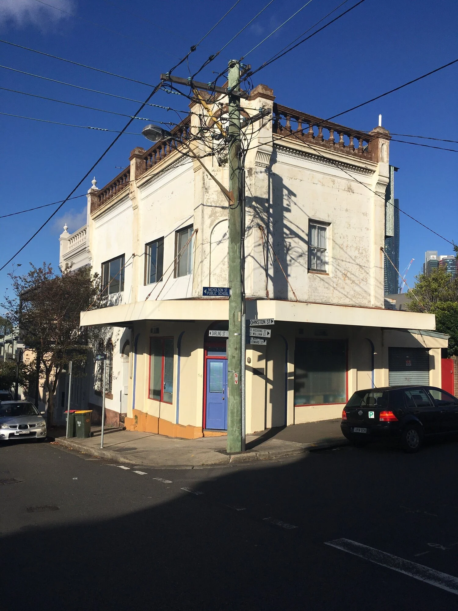 An original 1888 Corner butchers shop plus adjoining terrace restoration and infill development. The project involved reinstating original two storey corner verandah, restoring the street façades and internal alterations and additions to create a wine bar with apartment above and a three bedroom terrace with roof deck and internal courtyard. Featuring a two storey polycarbonate façade to the internal double height rear living and dining area.